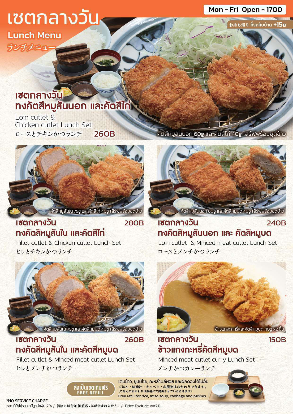 11.00 น. –21.00น. (ปิดรับออเดอร์ 20.30 น.) อาจมีการปรับเปลี่ยนเวลาทำการของแต่ละสาขาตามความเหมาะสม |